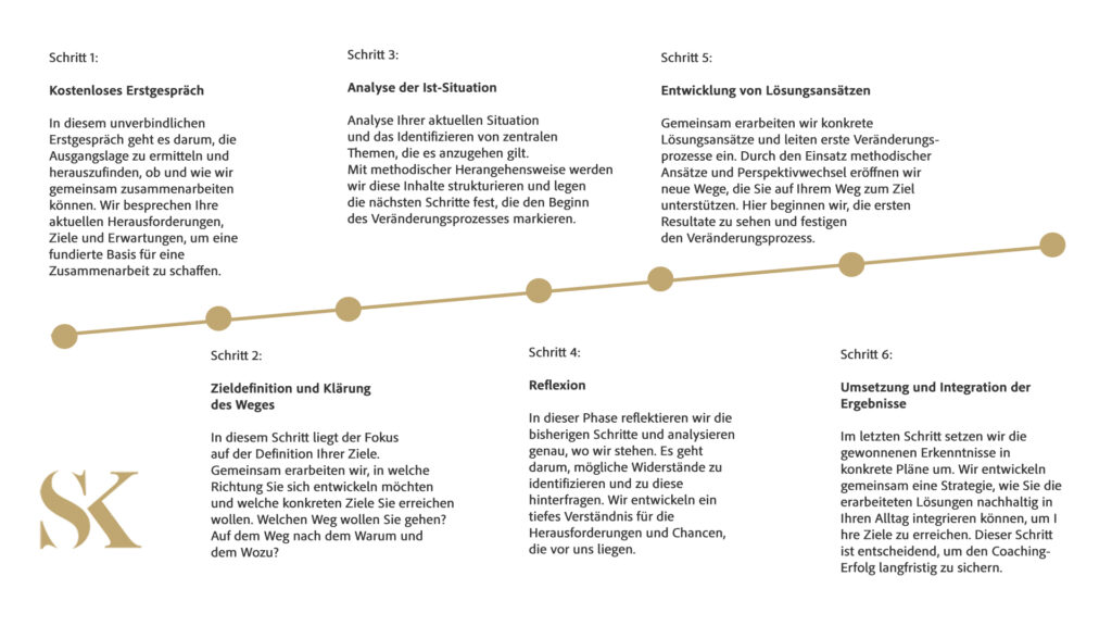 Umsetzung und Integration der Ergebnisse Im letzten Schritt setzen wir die gewonnenen Erkenntnisse in konkrete Pläne um. Wir entwickeln gemeinsam eine Strategie, wie Sie die erarbeiteten Lösungen nachhaltig in Ihren Alltag integrieren können, um Ihre Ziele zu erreichen. Dieser Schritt ist entscheidend, um den Coaching-Erfolg langfristig zu sichern.